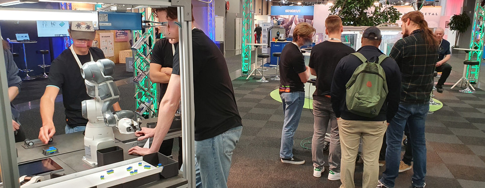 Förra veckan stod vi på Svenska Mässan och visade upp våra olika smarta lösningar på Underhållsmässan 2022. Årets tema var Smart Maintenance. Förutom vi som jobbar i projektet så stod även ungdomar från GTG på mässan. Klass Mimas som läser sitt tredje år på den industritekniska linjen lärde vi upp under 5 halvdagar, både på workshops hos oss på Ericsson där de lärde sig om våra demonstratorer, samt studiebesök på ABB, SKF och Atlas Copco för att lära sig om deras olika utrustningar vi har i demonstratorerna. Väl på mässan fick de chans att som framtida underhållstekniker visa upp sig för arbetsgivare och tala med kunder.
